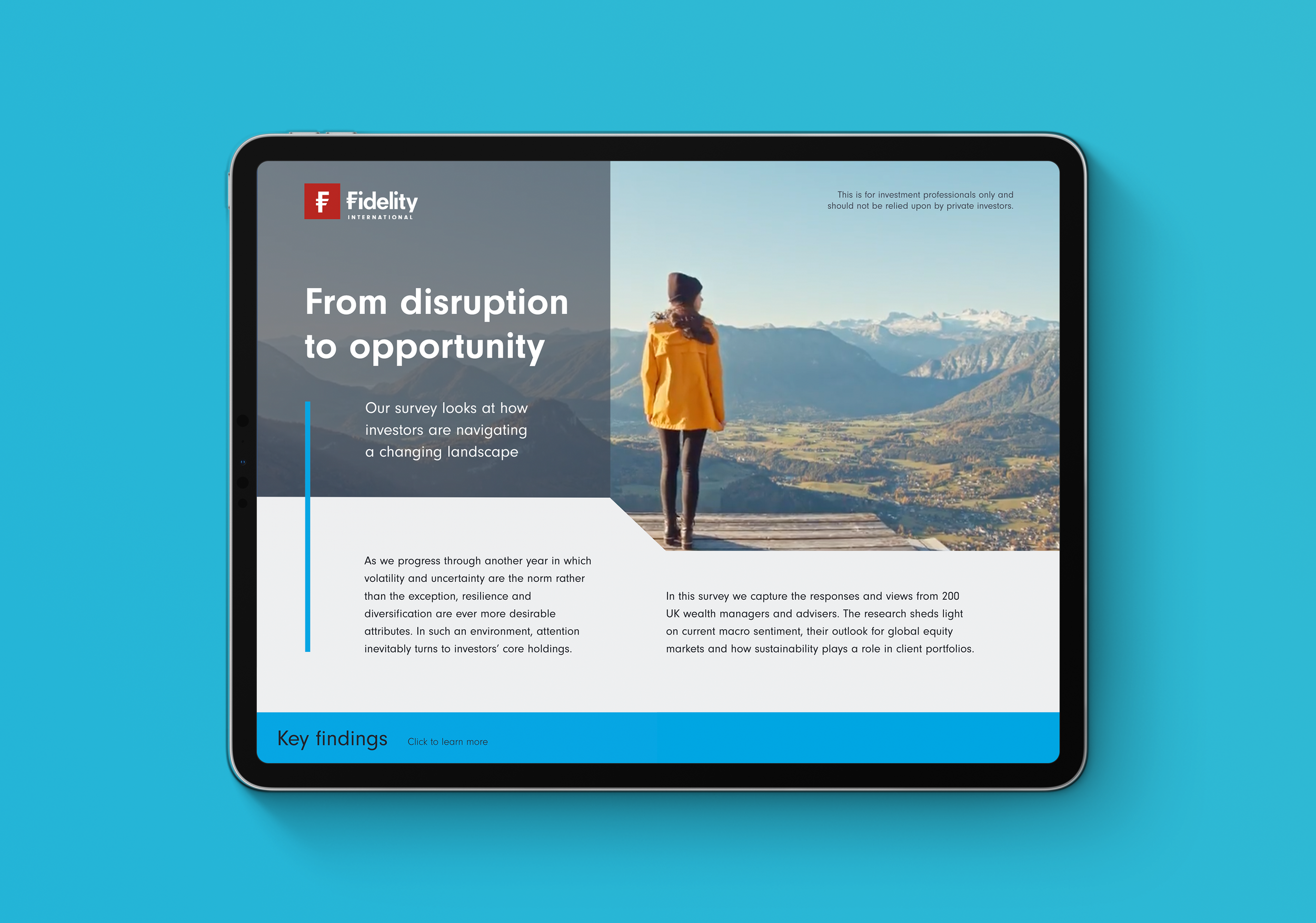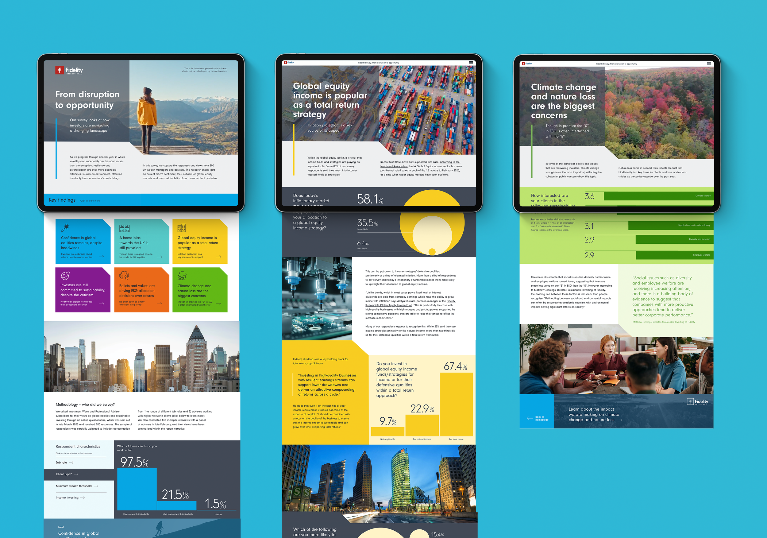 The report featured a multi-section layout, breaking down insights into digestible segments for seamless navigation. Dynamic data visualisations were created to bring statistics to life, using animation and interactive elements to enhance user engagement. While adhering to the Fidelity brand identity, the design pushed creative boundaries—introducing bold layouts and modern typography to elevate the overall experience. The result was a compelling digital report that communicated key insights in a visually engaging and user-friendly format.