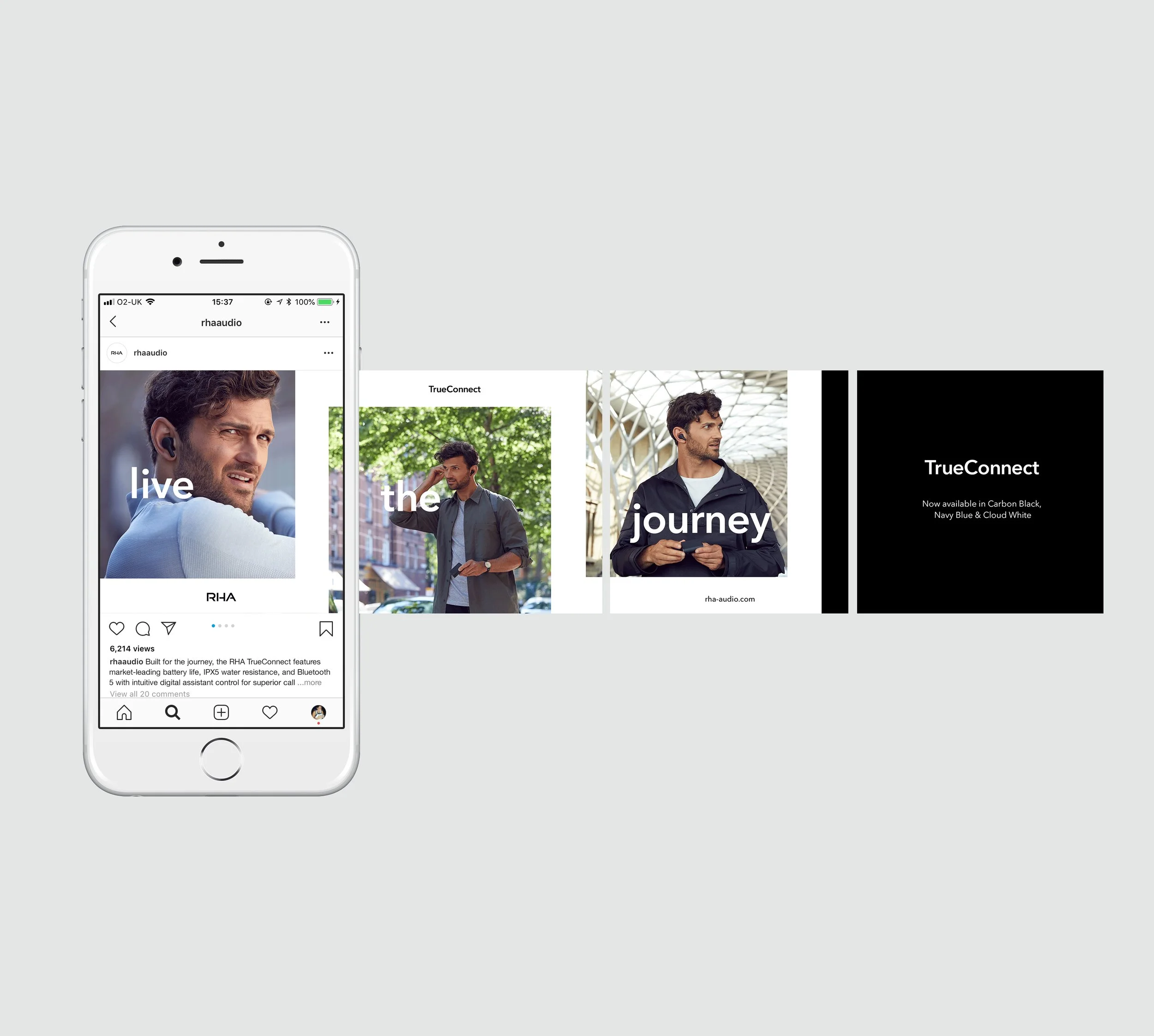 RHA Audio re-launched their TrueConnect earbuds with a digital-led campaign introducing a new colour range. The “Live the Journey” campaign featured three users, each highlighting key product features: sweat resistance, call handling, and music quality. The campaign photography and brand films were part of a marketing and advertising strategy used across social media and in the press, with additional printed adverts created for RHA’s travel audience in both airport and airline magazines.